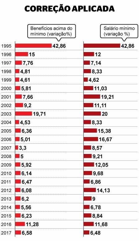 Em janeiro de 2017, os segurados do INSS que ganham acima do salário mínimo tiveram o benefício reajustado em 6,58%, conforme a variação do INPC de 2016. Este grupo, com benefícios maiores, tem tido aumentos anuais apenas para recompor a alta do custo de vida, sem direito a ganho real (acima da inflação).