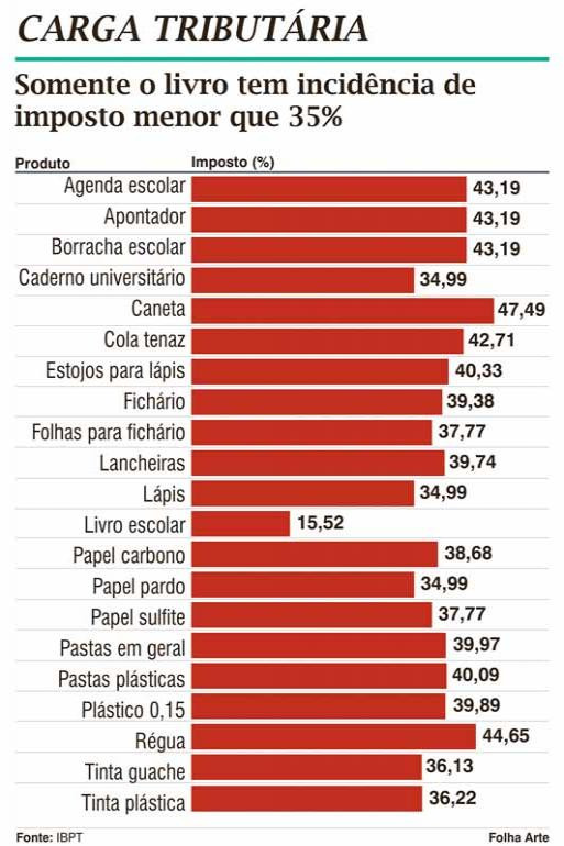 Parte da lista de material escolar poderia custar bem menos não fosse a exagerada carga tributária brasileira. É o que mostra o Instituto Brasileiro de Planejamento e Tributação (IBPT). A entidade divulgou uma relação com 21 itens básicos. Em 20 deles, o imposto escondido no preço é de 35% ou mais. A caneta esferográfica, por exemplo, sofre uma tributação de 47,49%. Somente o livro escolar tem uma incidência reduzida de tributos: 15,5%.