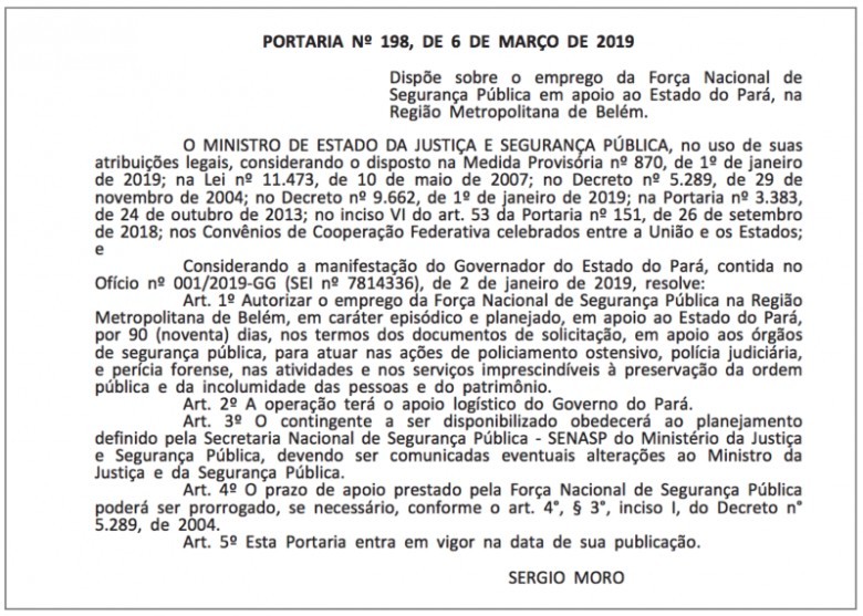 A medida foi publicada no Diário Oficial da União nesta 5ª feira (7.mar.2019). Ela atende ao pedido feito em 2 de janeiro pelo governador do Estado, Helder Barbalho (MDB), que apresentou índices de criminalidade para justificar o pedido.