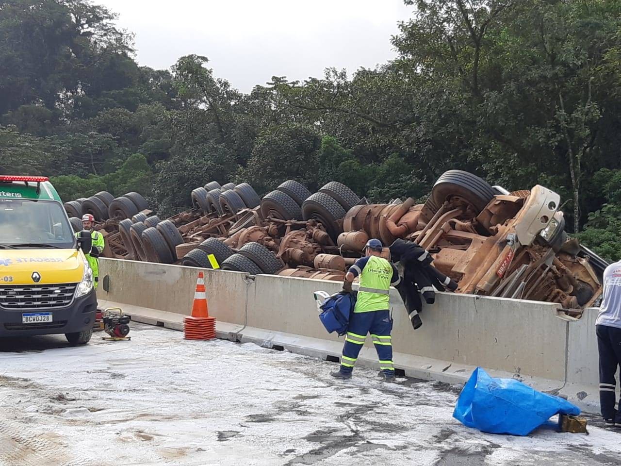 Após bater contra os dois carros, o caminhão ainda bateu na mureta de proteção da via e tombou na rodovia, parando com as rodas para cima. O motorista, que ficou preso às ferragens, foi socorrido e encaminhado em estado grave ao Serviço de Atendimento ao Usuário (SAU) da Autopista Litoral Sul – concessionária que administra o trecho.