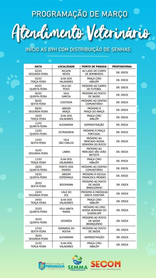 O atendimento móvel veterinário está com novo horário de funcionamento. “Agora, a equipe segue para os bairros no período da manhã, por volta das 9h quando são distribuídas senhas por ordem de chegada aos moradores”, informa o secretário municipal de Meio Ambiente, Vinícius Higashi.