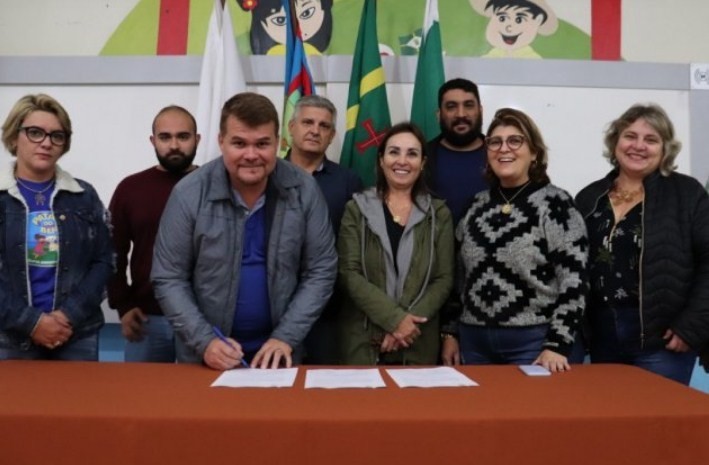 A secretária de Educação, Vandecy Dutra, esteve presente na assinatura da ordem de serviço, junto com servidores da Secretaria Municipal de Educação (Semedi) e da primeira-dama, Amanda Roque.
