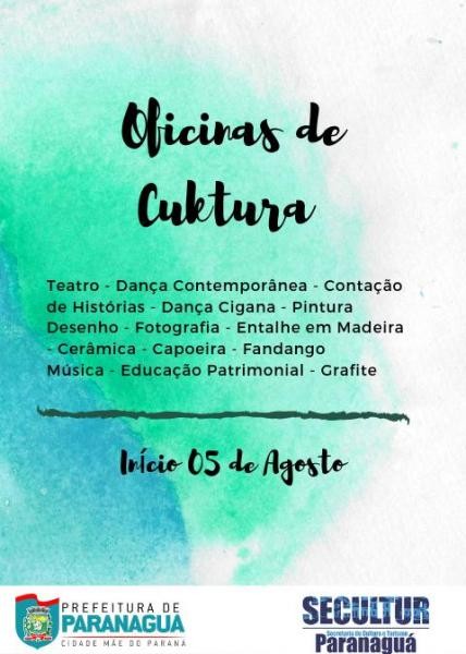 A Prefeitura de Paranaguá, por meio da Secretaria Municipal de Cultura e Turismo, (Secultur), informa que as inscrições para todas as oficinas estão abertas. Aulas serão retomadas nesta segunda-feira, dia 05.