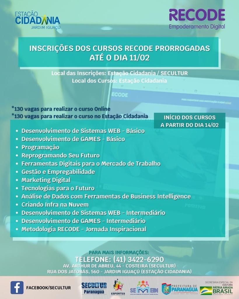 A Prefeitura de Paranaguá, por meio da Secretaria Municipal de Cultura e Turismo, (Secultur), informa que as inscrições para os cursos que serão ministrados na Estação Cidadania (antigo CEU das Artes), foram prorrogadas até o dia 11 de fevereiro. Vale lembrar que são 130 vagas disponíveis.