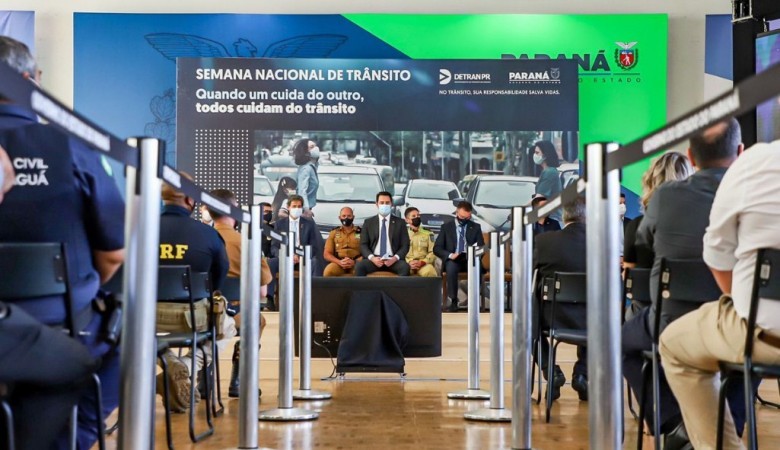 Representando o prefeito Marcelo Roque, o responsável pela Superintendência Municipal de Trânsito (Sumtran), GCM Lêonidas Martins Júnior, participou nesta segunda-feira, 20, da cerimônia que marcou o início das comemorações da Semana Nacional de Trânsito no Palácio Iguaçu em Curitiba. O evento que contou com a presença do governador Carlos Massa Ratinho Júnior e do Secretário Nacional de Transportes, Frederico de Moura Carneiro, apresentou uma série de ações para aumentar a agilidade e a eficiência do Departamento de Trânsito do Paraná (Detran-PR).