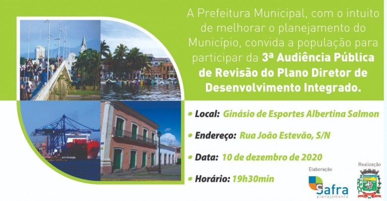 A Prefeitura de Paranaguá, por meio da Secretaria Municipal de Urbanismo (Semur), convida a população para participar da 3.ª Audiência Pública de Revisão do Plano Diretor de Desenvolvimento Integrado (PDDI).