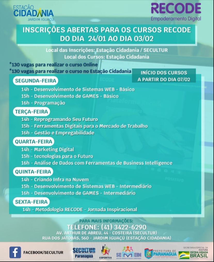 A Prefeitura de Paranaguá, por meio da Secretaria Municipal de Cultura e Turismo, (Secultur), está disponibilizando 130 vagas dos cursos demandados pela Secretaria Especial de Cultura estão disponíveis na Estação Cidadania (CEU das Artes), localizado na Rua dos Jatobás, 560, no bairro Jardim Iguaçu.