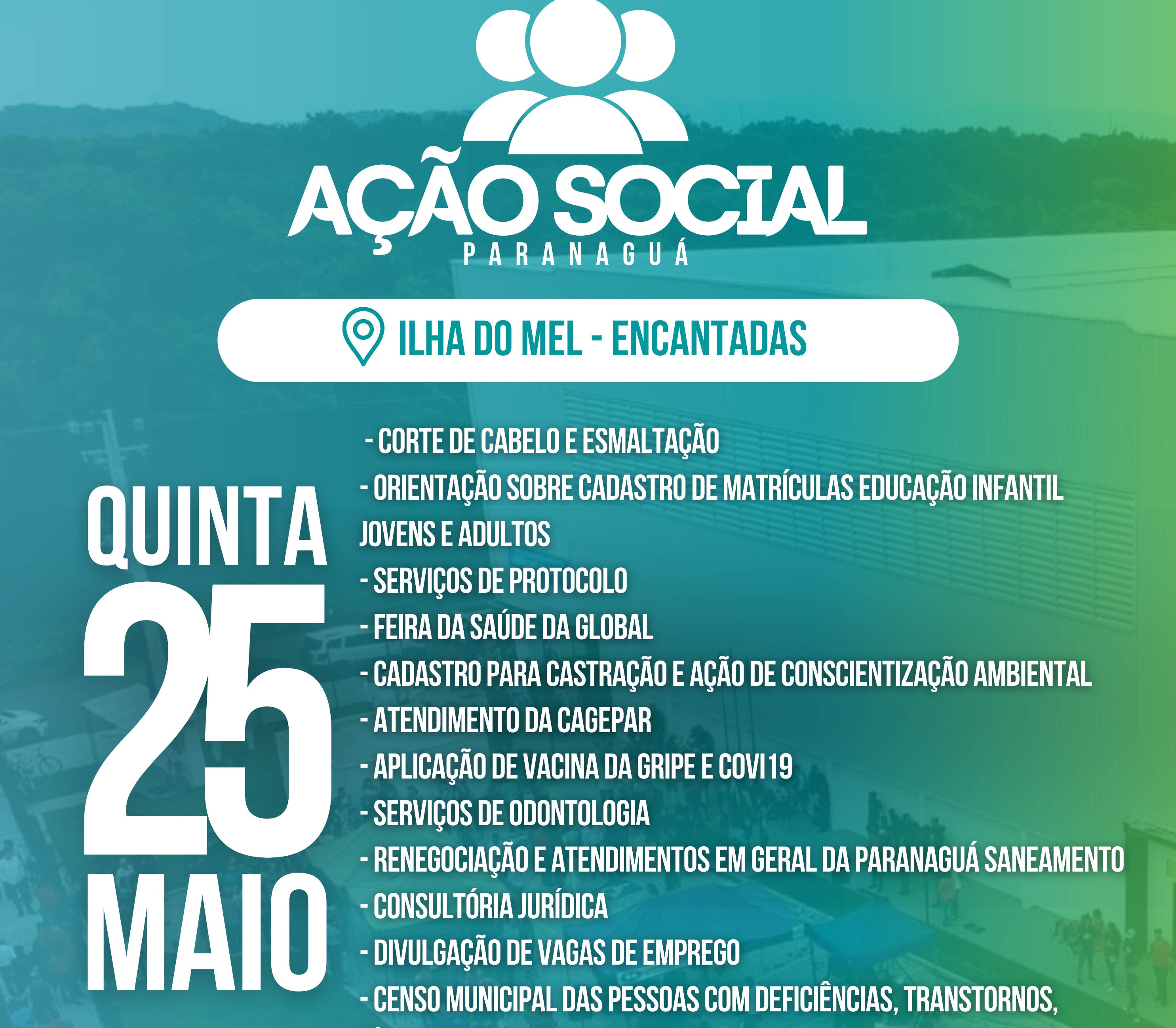 Os moradores de Encantadas, na Ilha do Mel, vão receber a feira de serviços Ação Social no próximo dia 25 de maio, das 10h às 16h, na Escola Municipal de Encantadas.