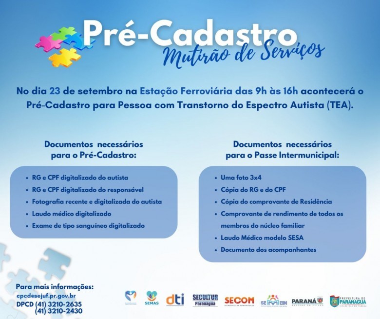 O mutirão para a realização efetiva da Carteira de Identificação da Pessoa com Transtorno do Espectro Autista (CIPTEA) e do Passe Livre Intermunicipal, acontecerá no 23/09 na Estação Ferroviária, das 9h às 16h.