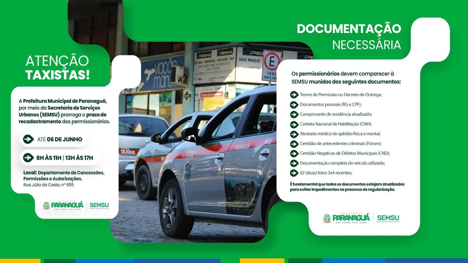 A Prefeitura de Paranaguá, por meio da Secretaria Municipal de Serviços Urbanos (Semsu), informa que foi prorrogado até o dia 6 de junho o recadastramento dos permissionários do serviço de táxi no município. O objetivo é garantir que todos os profissionais tenham a oportunidade de atualizar a situação cadastral.