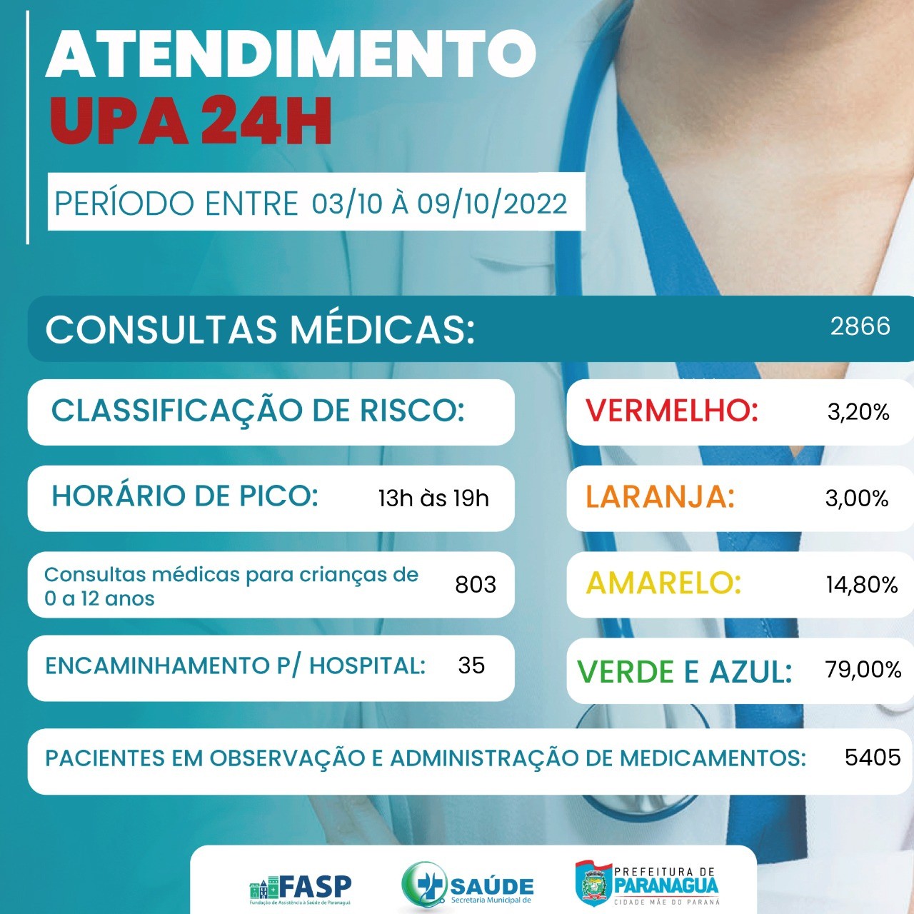 A Fundação de Assistência à Saúde de Paranaguá (Fasp) apresentou seu relatório semanal de atendimentos na Unidade de Pronto Atendimento (UPA). Conforme o levantamento, de 3 a 9 de outubro foram realizadas 2.866 consultas médicas, sendo que 79% destes atendimentos os pacientes foram classificados como casos leves ou moderados.