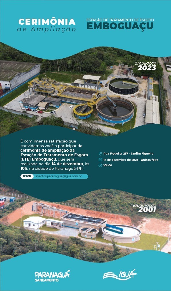 A partir da segunda quinzena de dezembro, mais de 12 mil habitantes de Paranaguá (litoral do estado do Paraná) passam a contar com os serviços de tratamento e coleta de esgoto graças a ampliação da Estação de Tratamento de Esgoto (ETE) Emboguaçu. O evento de inauguração, que acontece dia 14 de dezembro, na Paranaguá Saneamento, terá a presença de autoridades públicas e do CEO da Iguá, Roberto Barbuti.