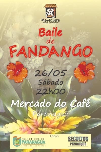 Neste sábado, 26, haverá o tradicional Baile de Fandango no Mercado Municipal do Café. O grupo Mandicuera garante a animação, a partir das 22h. A prefeitura de Paranaguá promove o evento.