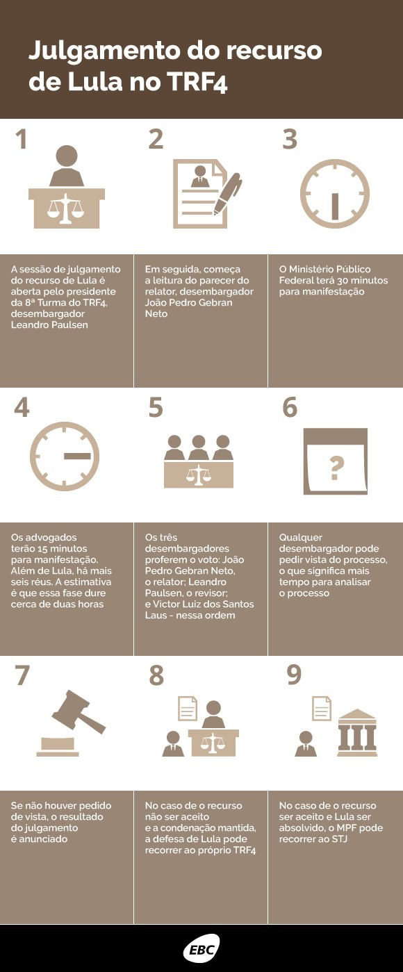 Na análise do recurso, os desembargadores podem seguir três linhas de decisão: confirmar a sentença de Moro e condenar o ex-presidente; acolher o recurso da defesa e absolver o réu; ou pedir vista para ter mais tempo para avaliar o processo.