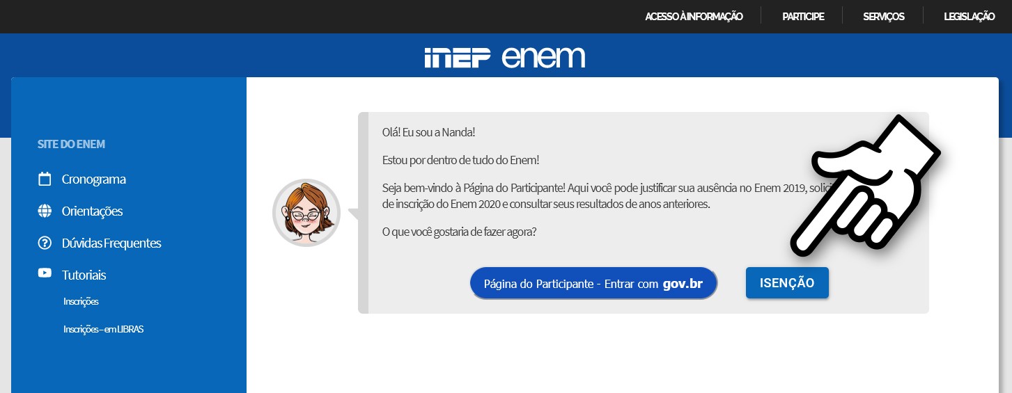 Todas as solicitações de isenção devem ser feitas na Página do Participante. Não há exceções, a única maneira de entrar na fila de requerimento é o formulário digital, que pode ser acessado de computadores, celulares ou tablets. Quem filtra os participantes é o Instituto Nacional de Estudos e Pesquisas Educacionais (Inep), um órgão do Ministério da Educação (MEC).