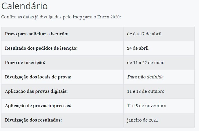 Em 2019, cerca de 3 milhões de pessoas solicitaram a isenção da taxa, que custava R$ 85. O valor para as provas de 2020 ainda não foi divulgado. O prazo para pleitear a isenção neste ano vai até o dia 17 de abril.