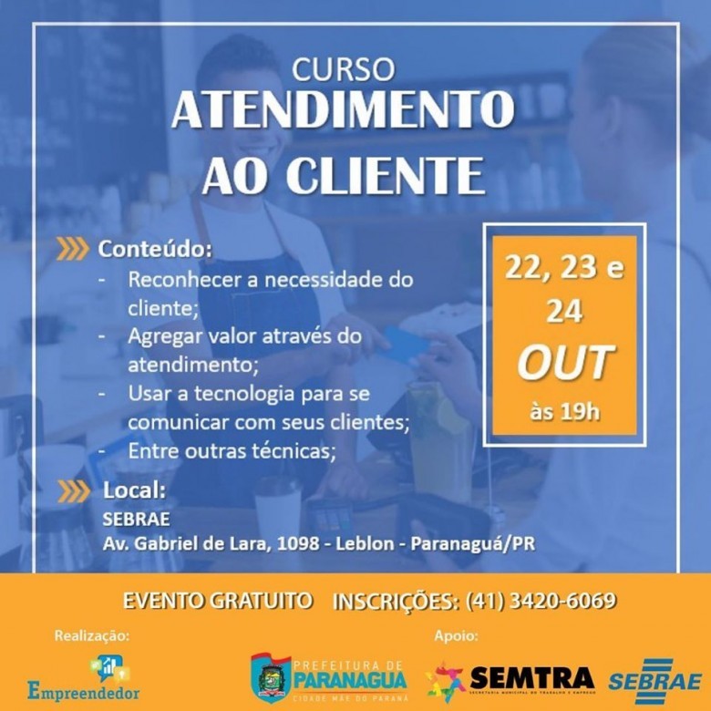 A Prefeitura de Paranaguá, por meio da Secretaria Municipal do Trabalho, Comércio, Indústria e Assuntos Sindicais (SEMTRA), em parceria com o Sebrae, está oferecendo curso gratuito de capacitação para os microempreendedores individuais (MEI) e pequenos empreendedores com o tema: Atendimento ao Cliente.