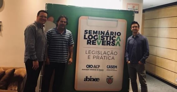 O secretário municipal de Meio Ambiente Raphael Rolim de Moura, o biólogo João Roberto Barros Maceno Silva e o engenheiro ambiental Vinícius Yugi Higashi participaram durante a manhã desta terça-feira, 2, do Seminário de Logística Reversa – Legislação e Prática, na Associação Comercial do Paraná, em Curitiba.