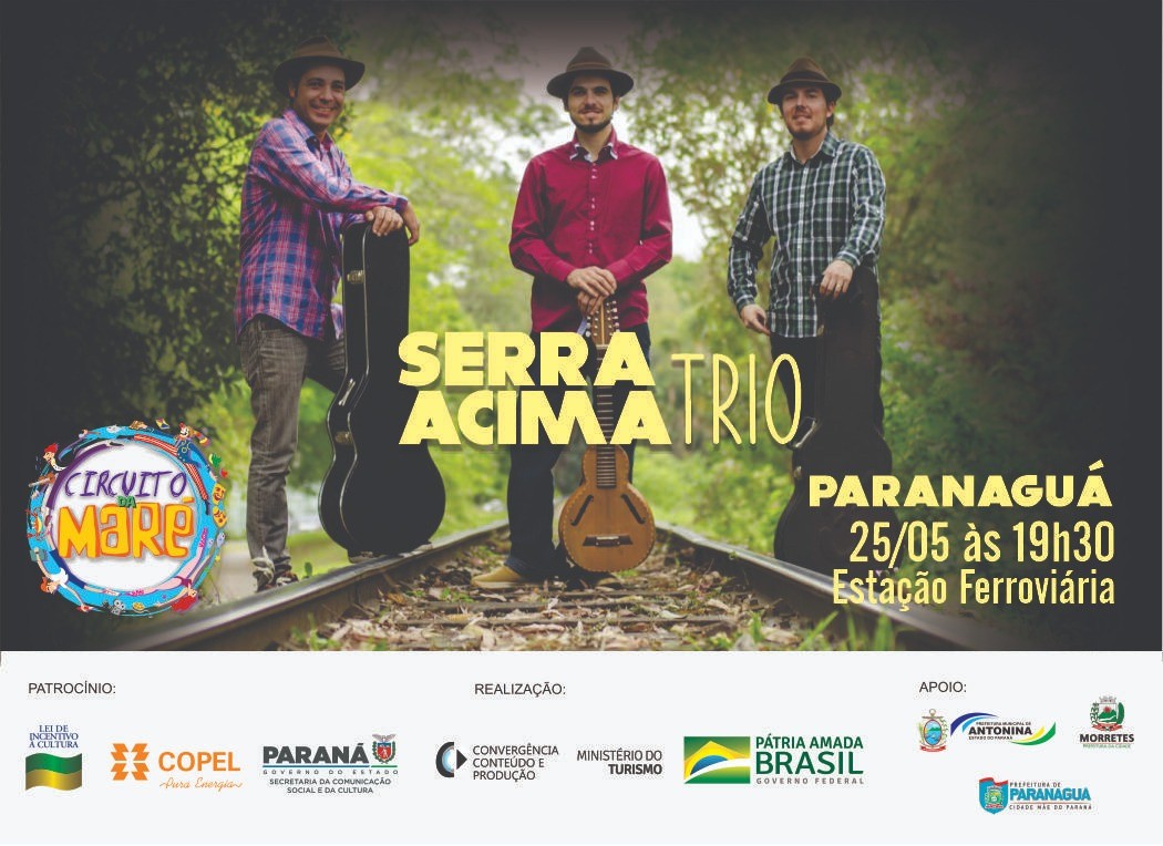 A Prefeitura de Paranaguá, por meio da Secretaria Municipal de Cultura e Turismo, (Secultur), informa que nesta quarta-feira, 25, a partir das 19h30 acontece a apresentação musical do Trio Serra Acima, nas dependências da Estação Ferroviária.