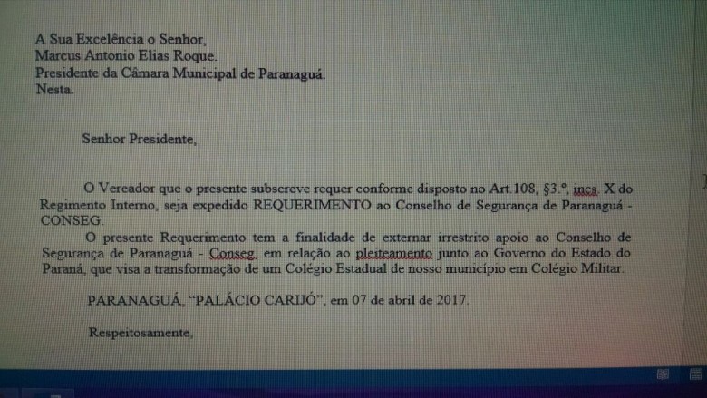 Na noite desta última terça feira foi aprovado por unanimidade o requerimento que busca a mudança de um colégio público para o colégio militar na cidade de Paranaguá.